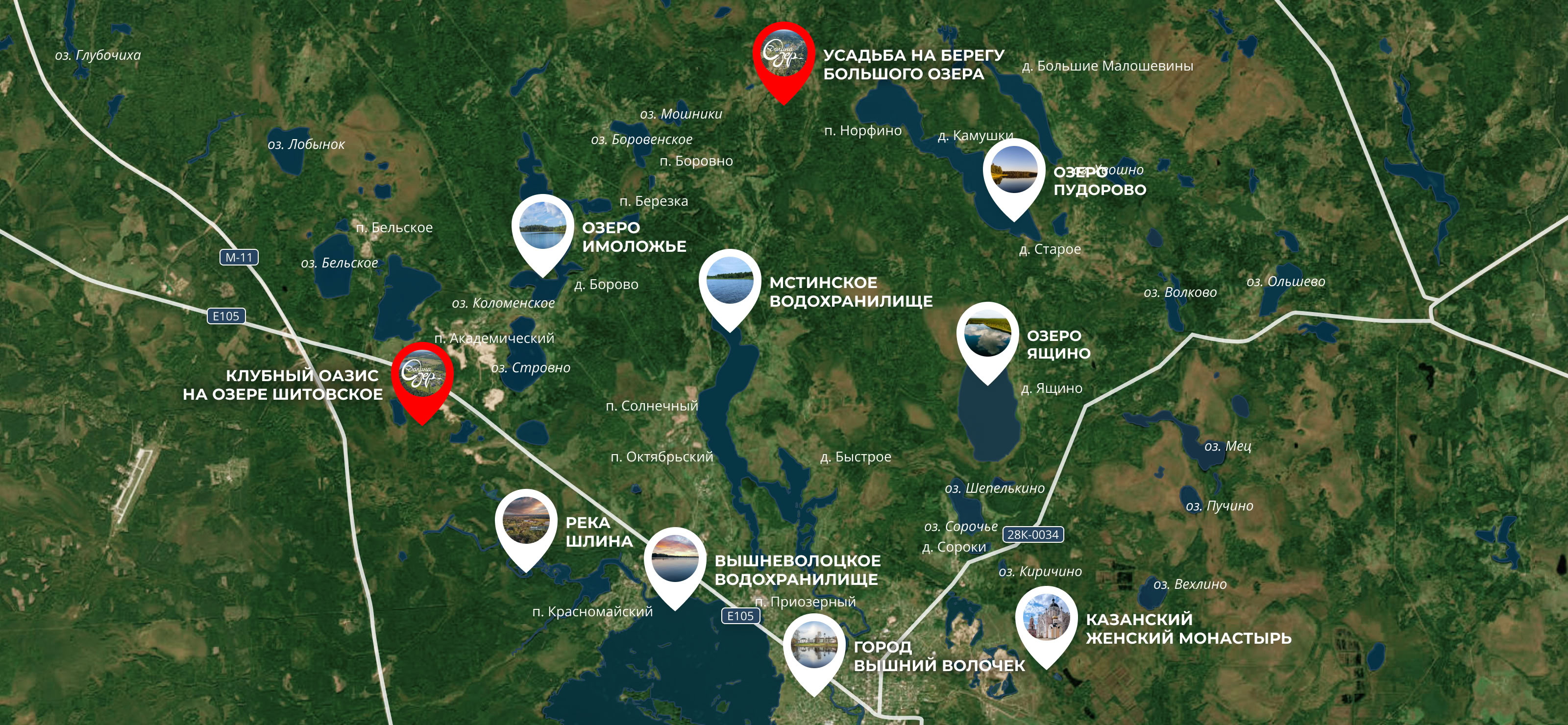 Агропоселок расположен в Вышневолоцком городском округе, рядом с деревней Дуброво-Солнечное. Его уникальность — в природном окружении: с северной стороны находится озеро Большое, а с юга — река Мста, что формирует редкую двойную береговую линию. Территория отличается открытыми ландшафтами, чистым воздухом и естественной зеленью. Камовый рельеф с преобладанием песчаных грунтов обеспечивает естественный дренаж и благоприятные условия для размещения домов.